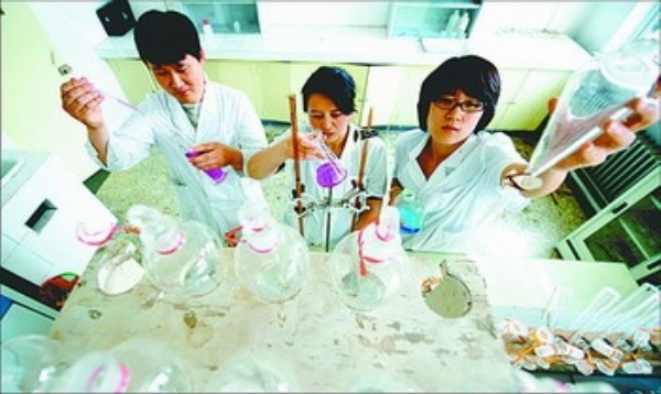 右图 秦皇岛市引青管理局水质监测中心,检测人员正在分析水样。该中心主要负责引青工程水质检测,同时对秦皇岛市三大水源地实施水质监测。