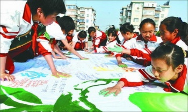 秦皇岛市燕秀丽小学的学生,在宣传条幅上写下自己参与低碳生活的目标。秦皇岛市开展多种形式的活动,向市民宣传低碳的理念。