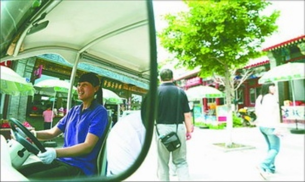 电动观光车在山海关风景区往返穿梭。秦皇岛市积极倡导低碳、环保、节能新理念,大力建设低碳旅游景区。