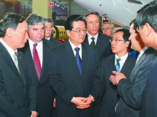 6月26日,国家主席胡锦涛在多伦多参观庞巴迪飞机制造厂。这是胡锦涛主席在听取公司负责人介绍情况。 新华社记者 樊如钧摄