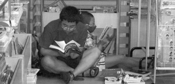 下图 书店成为了许多读者的精神家园,图为一对父子在西单图书大厦享受读书时光。
