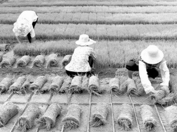 6月27日,台儿庄区邳庄镇沧庙村村民起秧苗插秧。 当日,山东省枣庄市台儿庄区4.2万亩稻田插秧全面展开,该区引入京杭大运河的优质水源,全面推广机械插秧技术,抓住有利农时进行水稻插秧,运河两岸一派繁忙的田园景象。 高启民摄 (新华社发)