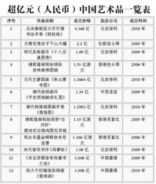 如“超亿元(人民币)中国艺术品一览表”中所示,目前全球拍卖额超过1亿元人民币的中国艺术品已经达到12件。这12件作品信息的汇集和分析,从几个侧面反映了市场的现状和走势。