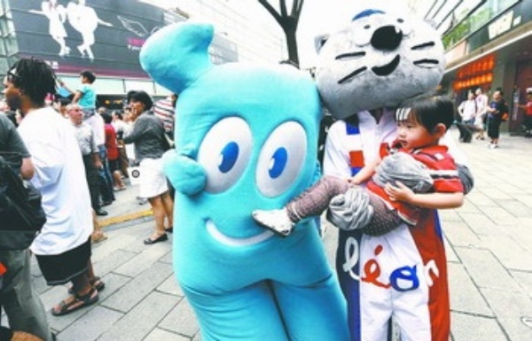 6月20日,世博园法国馆吉祥物小猫莱昂(右)和世博会吉祥物海宝在上海街头与游人互动。 当日,法国文化体验周在上海新天地拉开帷幕,在上海世博园进行常态化演出的法国多个文艺团体在上海新天地与游客同乐。此举旨在让来自世界各地的游客在游览世博园之后,还能在上海街头体会“更美的城市,更深的情谊”。 新华社记者 陈 飞摄