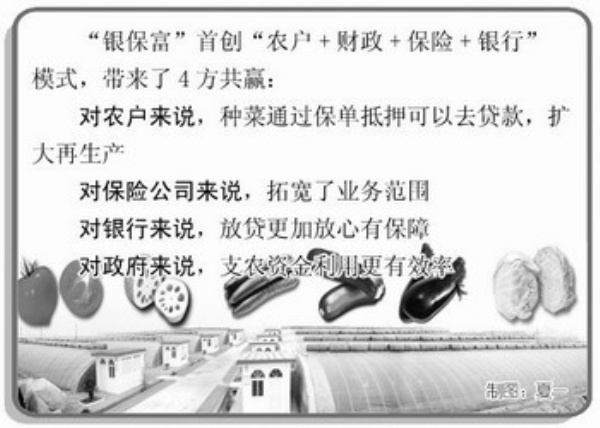 是什么带来了这样的变化?是设施蔬菜“银保富”。一个点子盘活了金融资源,“银保富”首创“农户+财政+保险+银行”模式,带来了4方共赢:对农户来说,种菜通过保单抵押可以去贷款,扩大再生产;对保险公司来说,拓宽了业务范围;对银行来说,放贷更加放心有保障;对政府来说,支农资金利用更有效率。