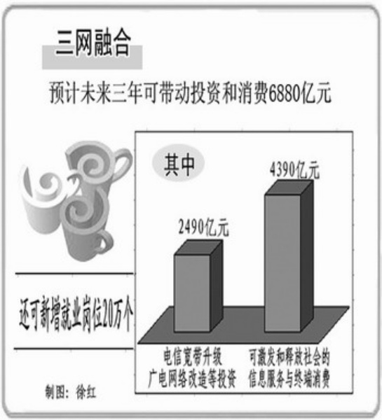 中国工程院院士、三网融合试点方案评审项目专家组负责人邬贺铨日前表示,预计三网融合未来三年可带动投资和消费6880亿元。其中,电信宽带升级、广电网络改造等投资2490亿元,可激发和释放社会信息服务与终端消费近4390亿元,另外,还可新增就业岗位20万个。