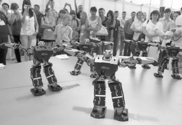 在莫斯科全俄展览中心,参展的机器人伴随音乐跳舞。日前,第10届全俄青年科技创造展在这里开幕,约1300名科技爱好者展示了自己的创新成果。他们之中最小的6岁,最大30岁。 新华社发
