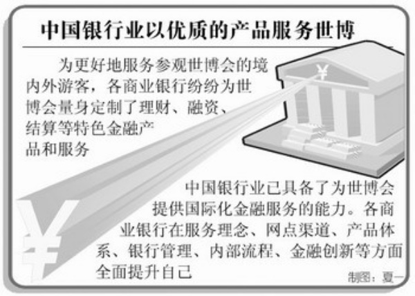 上海世博会开园迄今已迎来2000多万人的客流量,世博金融服务经受了实践的检验,中国银行业已具备了为世博会提供国际化金融服务的能力。各商业银行在服务理念、网点渠道、产品体系、银行管理、内部流程、金融创新等方面全面提升自己,以实际行动彰显着“城市,让生活更美好”的主题。