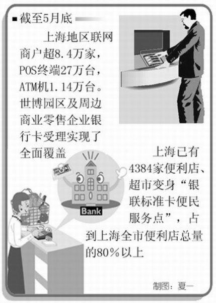 为让持卡人的上海之行更加轻松、方便,中国银联携手交通银行等商业银行和专业化服务机构,深入推动上海银行卡受理环境建设,使上海成为我国银行卡产业最为发达的地区之一,无论是发卡量、交易量,还是银行卡受理终端数量等都位居全国前列。截至5月底,上海地区联网商户超8.4万家,POS终端27万台,ATM机1.14万台。上海市商业零售业、旅游业能够受理银联卡的特约商户普及率超过95%,世博园区及周边商业零售企业银行卡受理实现了全面覆盖。
