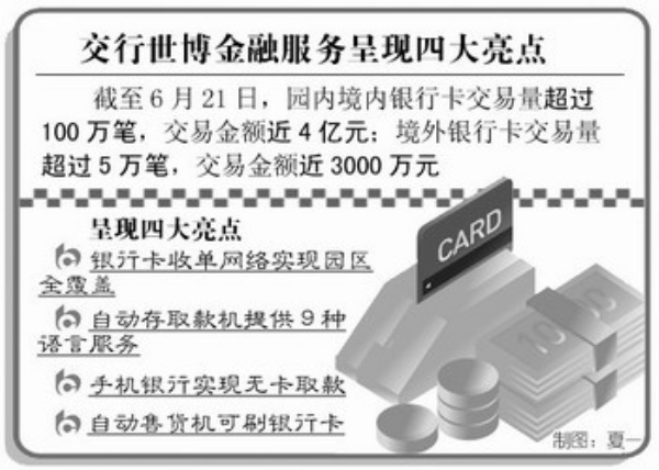 上海世博会开园两月,平均每天三四十万的入园客流量对于世博会银行服务的提供者———交通银行上海市分行而言,无疑是一场极大的考验。该行公布的数据显示,截至6月21日,园内境内银行卡交易量超过100万笔,交易金额近4亿元;境外银行卡交易量超过5万笔,交易金额近3000万元。交行上海分行充分调动各方力量,创新世博金融服务,呈现出四大亮点。