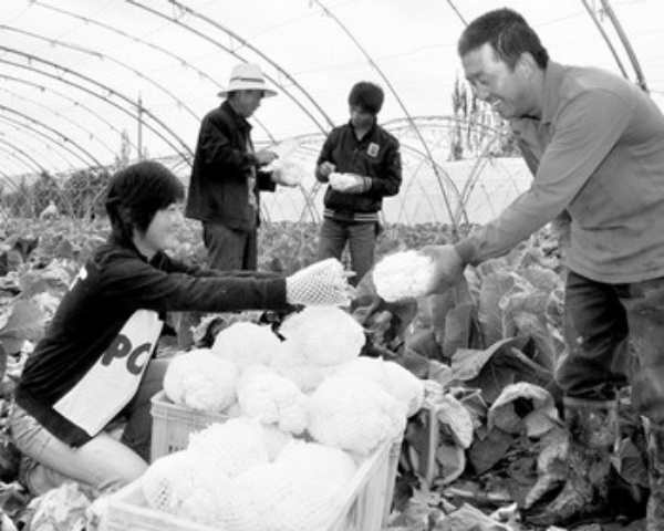甘肃兰州市皋兰县西岔镇团庄村无公害蔬菜基地,徐生连一家正在采收刚成熟的“先花70”白菜花。如今,西岔镇出品的万亩兰州高原夏菜走俏国内外市场。