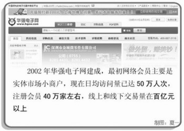现在老岑发货大部分是在网上进行。自从华强电子网开办以后,老岑就加入了这个电子交易平台,实现网上网下的互动,在网络平台进行信息发布、商情查询、网上交易、库存管理等工作,利用简单快捷、低成本的电子商务方式完成商贸活动。