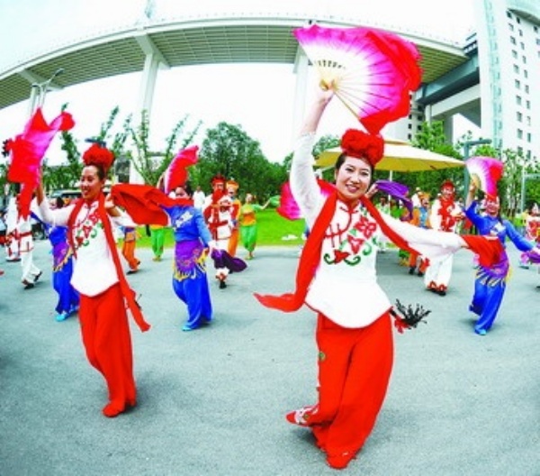 7月8日,山东的民间艺人在宝钢大舞台前表演地方秧歌。当日,以“文化齐鲁、魅力山东”为主题的上海世博会山东活动周开幕。 新华社记者 燕 雁摄