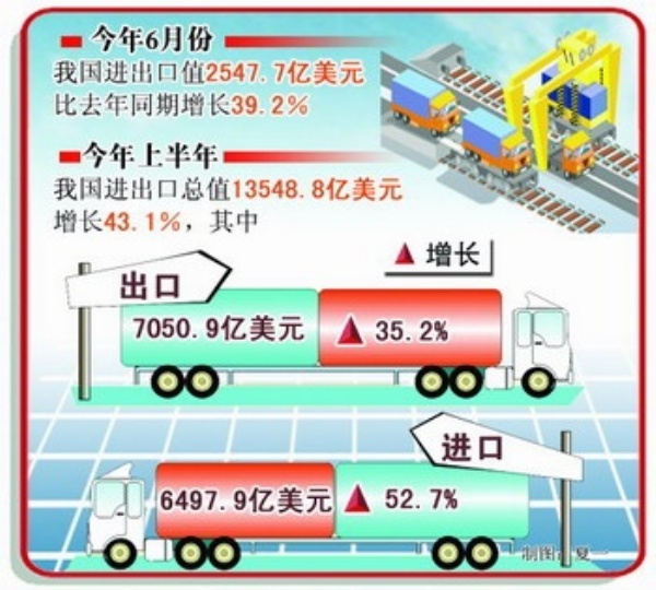 海关数据显示,6月份,我国出口1374亿美元,增长43.9%;进口1173.7亿美元,增长34.1%。其中,月度出口值也创2008年7月以来的历史新高。从环比来看,今年6月份进出口较5月份环比增长4.4%;其中出口环比增长4.3%,进口环比增长4.6%。上半年我国进出口总值达13548.8亿美元,增长43.1%。其中出口7050.9亿美元,增长35.2%;进口6497.9亿美元,增长52.7%;贸易顺差为553亿美元,下降42.5%。