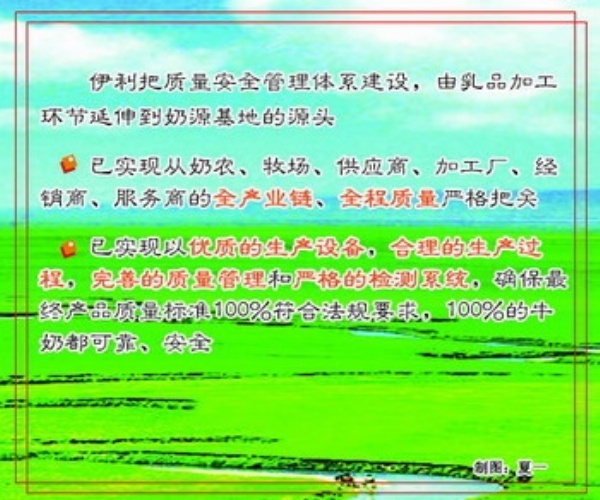 伊利已扎实地把质量安全管理体系建设,由乳品加工环节延伸到奶源基地的源头。这也是伊利打造“奥运和世博标准”的核心————绿色产业链质量管理体系建设工程。