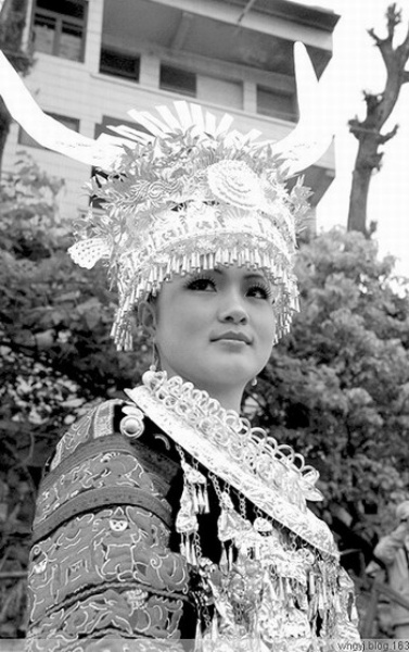 盛装的苗族姑娘头戴高高的银花冠,下沿圈挂银花带,花带下垂着银花坠,脖上是层层叠叠的银项圈,胸前戴银,背后披银,还有许多小银铃在身上叮咚作响。闪光华丽的银角,雕琢繁复的发簪,雍容厚重的项圈,镂空雕花的手镯……繁而不杂,艳而不俗。苗族姑娘被银饰环抱的脸庞在阳光的映衬下更显得洁白无瑕,光彩照人。