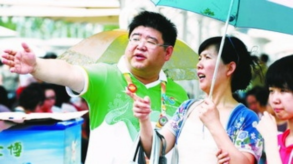 7月10日,志愿者王翔正在为游客指路。当日是上海世博会“志愿者主题日”。据悉,世博会期间上海市陆续有约8万名园区志愿者、10万名城市站点志愿者和近200万名城市文明志愿者上岗,在世博园区和城市的其他地方为各地游客提供各项帮助。 新华社记者 任军川摄