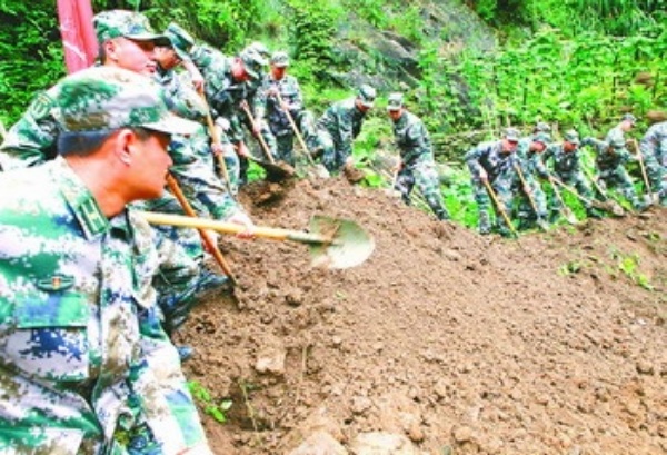 | 7月10日,休宁民兵应急分队在汊璜公路抢修现场清理路面。7月8日,安徽休宁县遭遇特大暴雨,休宁县紧急组织300多人全力抢修,到10日16时,行车便道已经全部打通。 倪受兵摄(新华社发) |