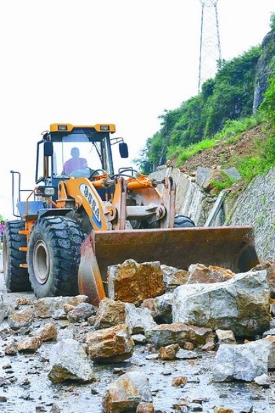 | 左图 7月10日,工作人员用装载机在凯(里)施(秉)公路上清理爆破的危石碎块。受近日持续强降雨影响,贵州省黔东南州凯里市境内多条公路边坡上出现不同程度的危石,凯里公路管理段组织爆破人员和机械设备力量及时清除,消除隐患。 陈沛亮摄(新华社发) |