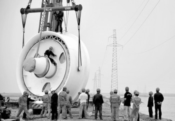 7月12日,山东沾化县北部沿海国华瑞丰(沾化)二期风电机箱正在吊装。并网发电后,瑞丰二期风电每年可提供上网电量2.1亿千瓦时,年销售收入可达1.28亿元。 赵国兴摄