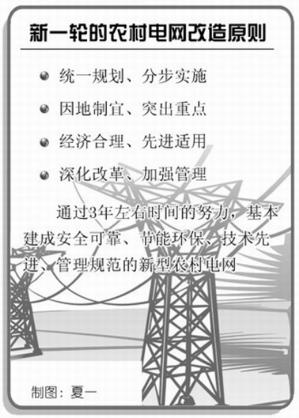 张国宝表示,新一轮的农村电网改造,要深入贯彻落实科学发展观,统筹城乡发展,适应农村用电快速增长要求,按照“统一规划、分步实施,因地制宜、突出重点,经济合理、先进适用,深化改革、加强管理”的原则升级改造。