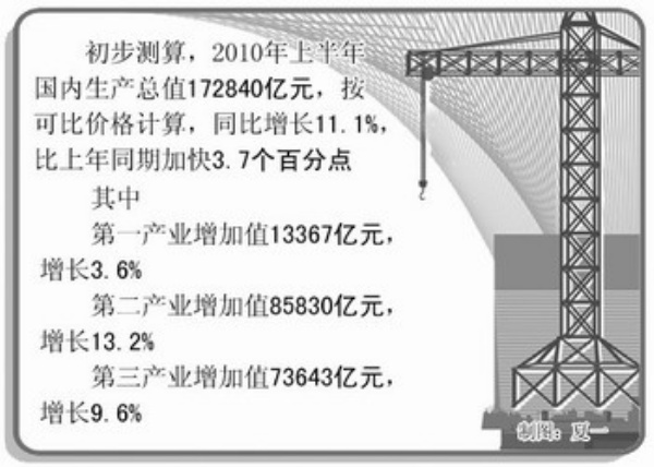 国家统计局15日发布的数据显示:初步测算,上半年国内生产总值172840亿元,按可比价格计算,同比增长11.1%,比上年同期加快3.7个百分点。其中,第一产业增加值13367亿元,增长3.6%;第二产业增加值85830亿元,增长13.2%;第三产业增加值73643亿元,增长9.6%。