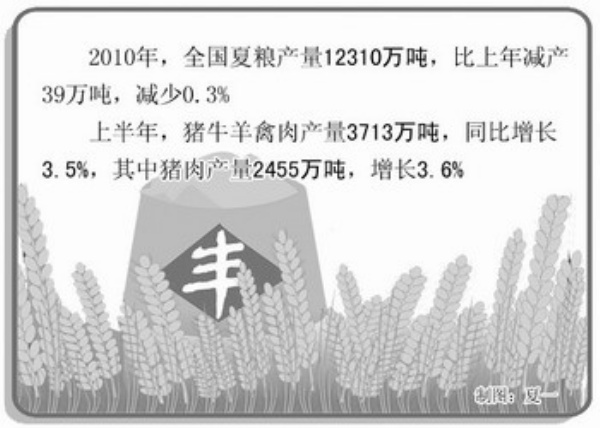 全国夏粮产量12310万吨,比上年减产39万吨,减少0.3%,是新中国成立以来第三个好收成。上半年,猪牛羊禽肉产量3713万吨,同比增长3.5%,其中猪肉产量2455万吨,增长3.6%。