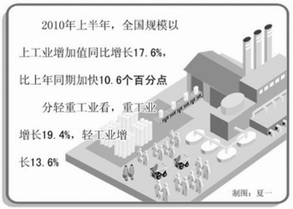 上半年,全国规模以上工业增加值同比增长17.6%,比上年同期加快10.6个百分点。分登记注册类型看,国有及国有控股企业增长17.7%,集体企业增长10.2%,股份制企业增长18.8%,外商及港澳台商投资企业增长17.0%。分轻重工业看,重工业增长19.4%,轻工业增长13.6%。分行业看,39个大类行业中38个行业实现同比增长。分地区看,东部地区增长16.7%,中部地区增长20.7%,西部地区增长17.6%。工业产销衔接状况良好,上半年工业产品销售率为97.6%,比上年同期提高0.4个百分点。