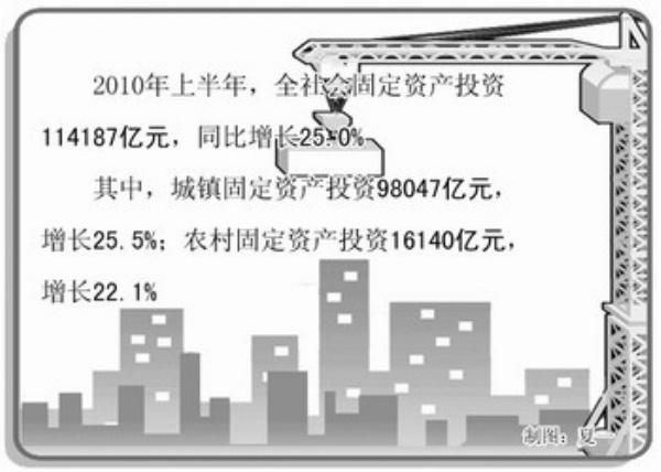 上半年,全社会固定资产投资114187亿元,同比增长25.0%。其中,城镇固定资产投资98047亿元,增长25.5%;农村固定资产投资16140亿元,增长22.1%。在城镇固定资产投资中,第一产业投资增长17.8%,第二产业投资增长22.3%,第三产业投资增长28.4%。分地区看,东部地区投资增长22.4%,中部地区增长28.0%,西部地区增长27.3%。上半年,房地产开发投资19747亿元,增长38.1%。