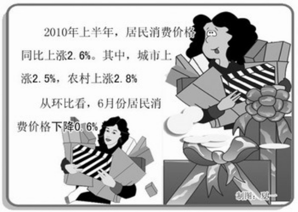 上半年,居民消费价格同比上涨2.6%。其中,城市上涨2.5%,农村上涨2.8%。分类别看,八大类商品五涨三落:食品上涨5.5%,烟酒及用品上涨1.7%,医疗保健和个人用品上涨2.7%,娱乐教育文化用品及服务上涨0.3%,居住上涨3.9%;衣着下降1.1%,家庭设备用品及维修服务下降0.6%,交通和通信下降0.1%。从环比看,6月份居民消费价格下降0.6%。上半年,工业品出厂价格同比上涨6.0%。从环比看,6月份下降0.3%。上半年,原材料、燃料、动力购进价格同比上涨10.8%。