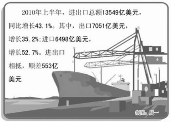 上半年,进出口总额13549亿美元,同比增长43.1%。其中,出口7051亿美元,增长35.2%;进口6498亿美元,增长52.7%。进出口相抵,顺差553亿美元。