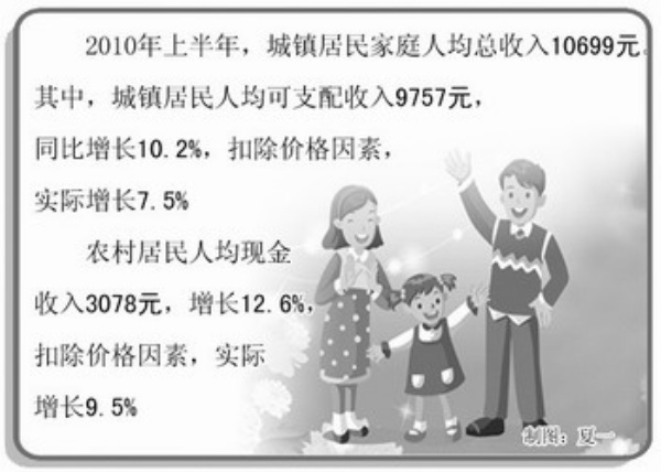 上半年,城镇居民家庭人均总收入10699元。其中,城镇居民人均可支配收入9757元,同比增长10.2%,扣除价格因素,实际增长7.5%。在城镇居民家庭人均总收入中,工资性收入增长9.7%,转移性收入增长13.2%,经营净收入增长8.6%,财产性收入增长20.7%。农村居民人均现金收入3078元,增长12.6%,扣除价格因素,实际增长9.5%。其中,工资性收入增长18.0%,家庭经营收入增长8.0%,财产性收入增长21.3%,转移性收入增长18.6%。上半年,扣除价格因素,城镇居民人均消费性支出实际增长7.2%,农村居民人均生活消费现金支出实际增长8.5%。