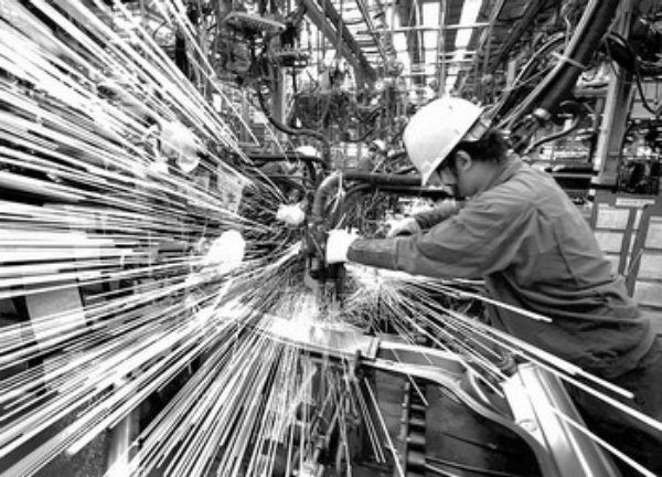 7月13日,在位于柳州的上汽通用五菱汽车股份有限公司,车身车间的工人在焊装线上作业。