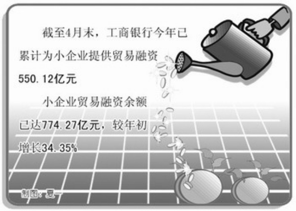 今年以来,工商银行加快了贸易融资产品与服务的创新步伐,特别是推出了一系列为小企业量身打造的贸易融资产品,有力推动了小企业贸易融资业务的发展。截至4月末,工行今年已累计为中小企业提供贸易融资550.12亿元,中小企业贸易融资余额达774.27亿元,较年初增长34.35%。