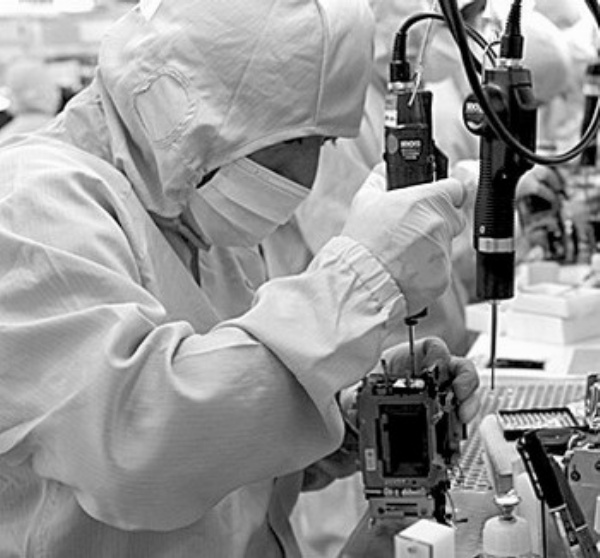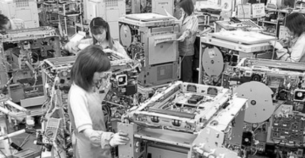 在佳能大分相机厂,已经看不到长长的生产流水线,工人们分成一个个小组,聚拢在工作台旁进行着相机组装,员工的后面,码放着各种相机部件,伸手便可取到。大分厂总裁村野先生介绍说,这就是佳能创立的“单元生产法”,每个单元一般有18个工人,共同负责将三四十个部件组装成一台相机,每个工人在一台相机上平均花费的时间是53秒,以此来确定每个班组的生产定额。这种生产方式十分灵活,即便只有60台相机的订单也能承接,可以更好适应市场变化。