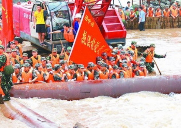 7月18日,南京军区某部官兵在南京高旺河决堤处封堵决口。 当日早晨5点40分,位于南京浦口区的长江支流高旺河入江口附近河堤发生管涌,导致堤坝出现破口险情。武警江苏总队近1300名官兵、南京军区某部官兵与驻地公安、消防、民兵等及时奔赴一线抗洪抢险。经过军民连续奋战,决口被成功封堵。 赵启瑞摄(新