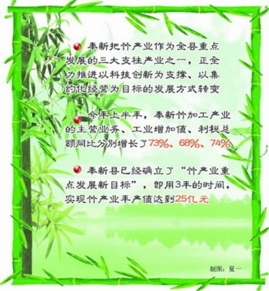 这些“惜竹如金”的政策措施,旨在加速推进竹产业的转型升级,真正做足“竹”文章。奉新已把竹产业作为全县重点发展的三大支柱产业之一,目前全县竹产业正全力推进以科技创新为支撑、以集约化经营为目标的发展方式转变。