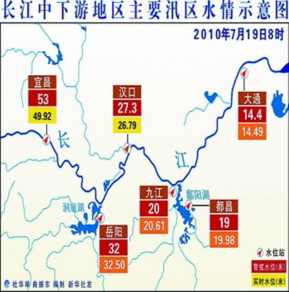 19日8时,长江上游干流寸滩水文站水位涨至183.56米,超过保证水位0.06米;三峡水库水位涨至146.93米,超过汛限水位1.93米。九江水文站超过警戒水位0.61米;长江下游干流大通水文站超过警戒水位0.09米;洞庭湖城陵矶水文站水位与警戒水位持平;淮河上游干流王家坝站水位超警0.12米,太湖平均水位超警0.25米,太湖周边河网地区有20个水文站超警,超警幅度为0.01至1.61米。