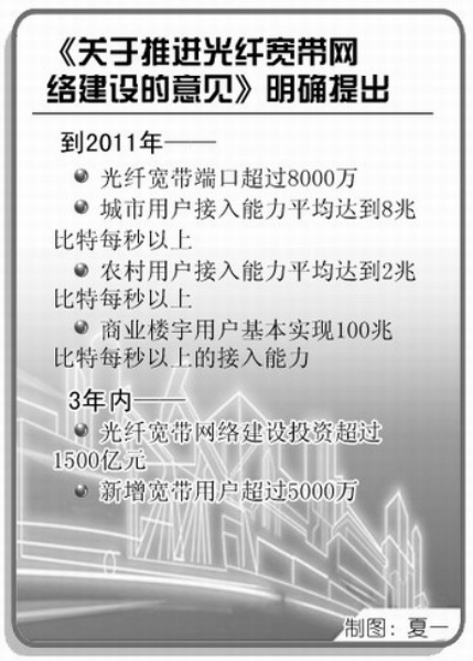 除了网络客户的需求,国家层面的政策也对宽带网络传输提出了更高要求。3月17日,工业和信息化部等7部委联合发布了《关于推进光纤宽带网络建设的意见》,要加强光纤宽带网络的共建共享和有效利用,积极推进三网融合。同步提升骨干网传输和交换能力。《意见》还明确指出,到2011年,光纤宽带端口超过8000万,城市用户接入能力平均达到8兆比特每秒以上,农村用户接入能力平均达到2兆比特每秒以上,商业楼宇用户基本实现100兆比特每秒以上的接入能力。3年内光纤宽带网络建设投资超过1500亿元,新增宽带用户超过5000万。