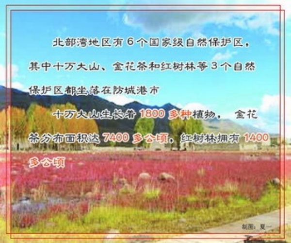 北部湾地区有6个国家级自然保护区,其中十万大山、金花茶和红树林等3个自然保护区都坐落在防城港市。十万大山生长着1800多种植物,是亚热带常绿阔叶林热带季雨林的“植物博物馆”;罕见的茶叶品种金花茶分布面积达7400多公顷,居世界之首,世界第一个金花茶基因库也设在这里;被称为“海底森林活化石”的红树林,全市种植面积达1400多公顷。