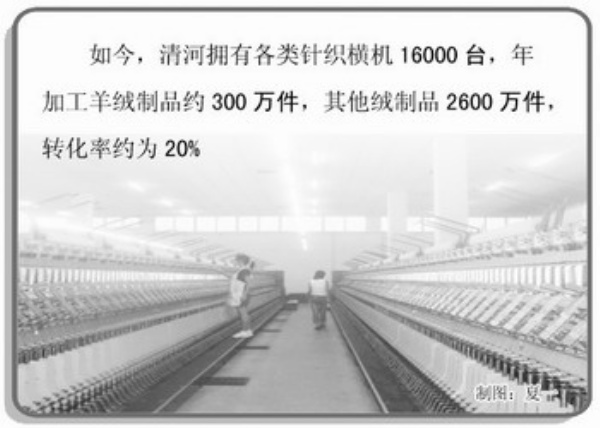 到天津、江浙一带考察了一番之后,臧国良决定不再做羊绒制品,而转做纱线。“做纱线就不存在季节性的问题,一年到头都可以生产,企业的需求量很大。”臧国良如今不仅给当地的三利集团、雄亚集团提供纱线,还成了红豆集团、恒源祥集团的供应商;不仅自己的工厂生产纱线,还在清河当地“放单”,找其他企业代做。臧国良说,这样做能为当地企业带来订单,自己又有一定的利润空间,是他比较满意的模式。