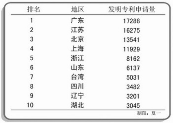 发明专利申请前10名地区