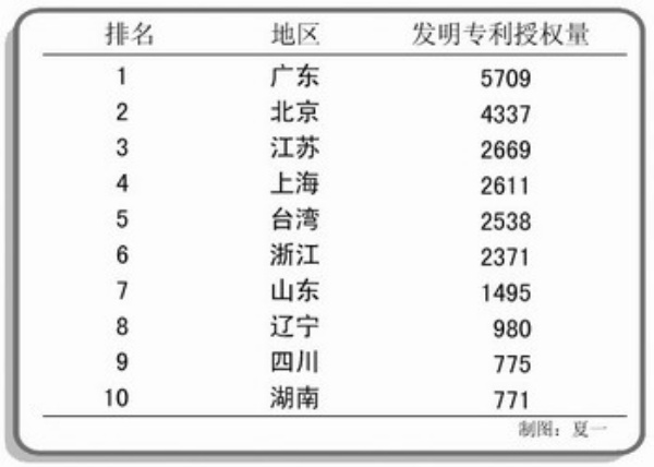 发明专利授权前10名地区