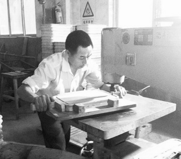 图3:工人正在用机器雕刻竹制工艺品。 本报记者 梁 婧摄