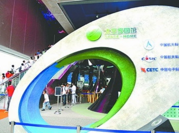 上海浦西世博园区,太空家园馆展馆内游人如织。太空家园馆建筑外立面采用的是纤维织物幕墙,这是一种可以回收利用的建筑材料,同时展区内大型球面壳体使用的材料有90%可回收再利用。