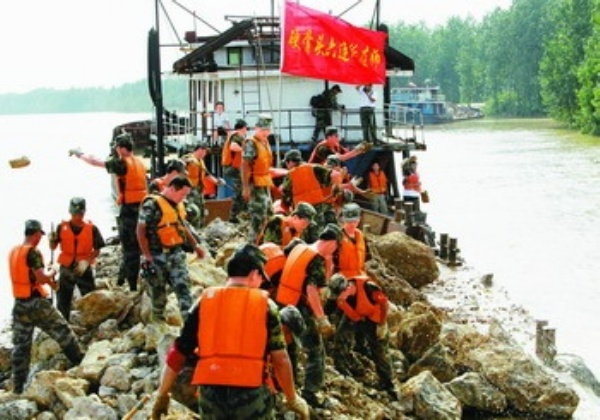 南京军区“硬骨头六连”所在师工兵营官兵在九江棉船镇崩岸险情水域抛石固岸(7月19日摄)。