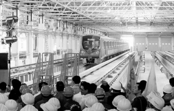 7月24日,一辆国产化电动客车停放在北京轨道交通房山线阎村车辆段停车列检库。当天,北京轨道交通房山线实现全线发电、全线轨通、新车到段以及运营进驻。据介绍,将于今年年底通车试运营的北京轨道交通房山线采用的是纯国产化电动客车,6节编组,时速每小时可达100公里。 本报记者 赵 晶摄