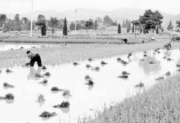 7月24日傍晚,浙江武义县王宅镇胡家村村民在秀美的田园里插种晚稻秧。