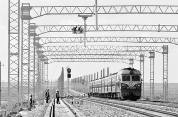 7月23日,施工人员在位于青海省海北藏族自治州海晏县境内的西格二线青海湖车站进行电气化铁路施工。青藏线西宁至格尔木增建二线铁路电气化工程进展迅速,今年年底可望全线建成。
