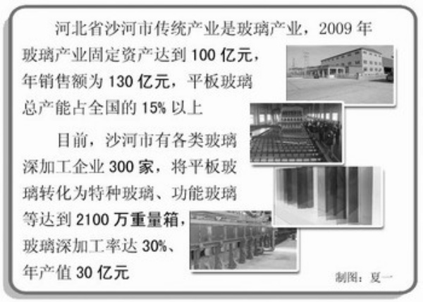 河北省沙河市传统产业是玻璃产业,是全国重要的玻璃生产销售基地。沙河市玻璃产品涉及钢化、装饰、建筑、家具洁具、制镜等5大类30多个品种,畅销国内外市场,年直接出口额达到2000万美元。转变经济发展方式、促进玻璃产业转型升级成为沙河市打造支柱产业的重要举措。